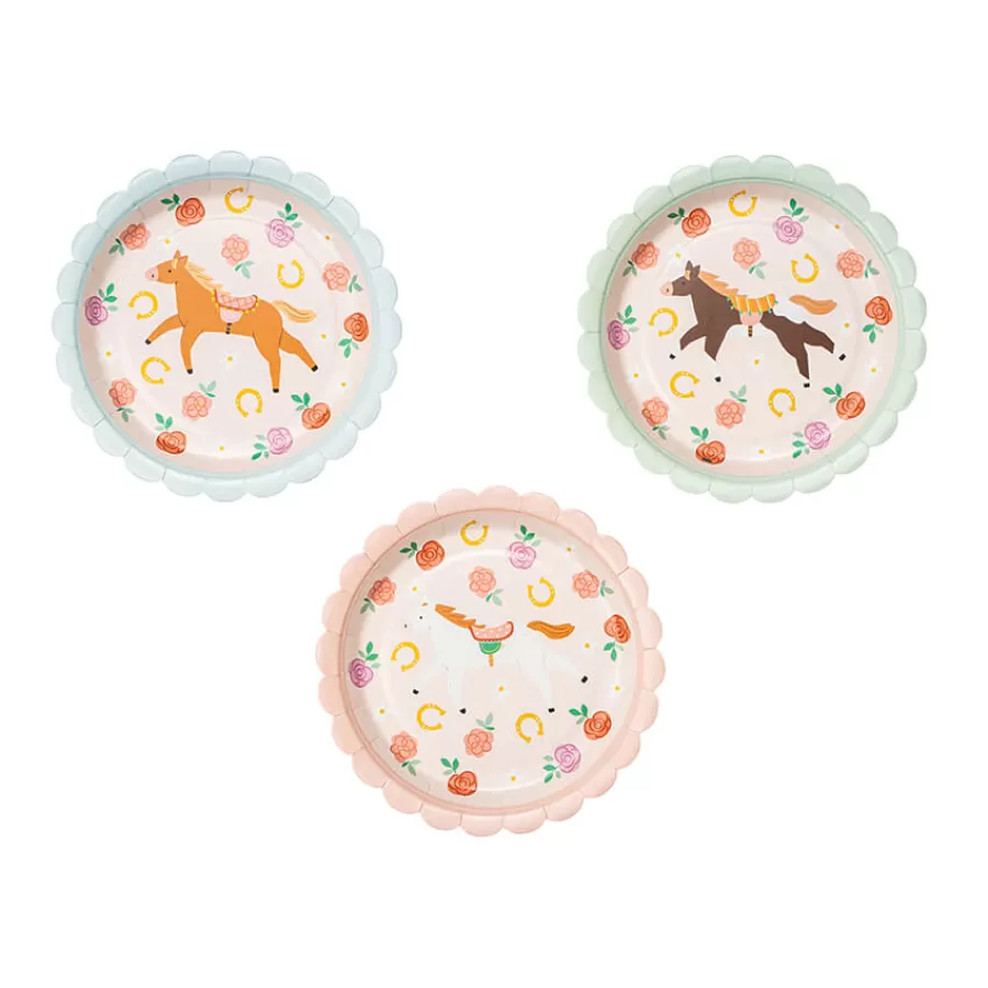 Χάρτινα πιάτα γλυκού με σχέδιο τα Αλογάκια, σε τρία χρώματα: ροζ, βεραμάν & σιέλ.