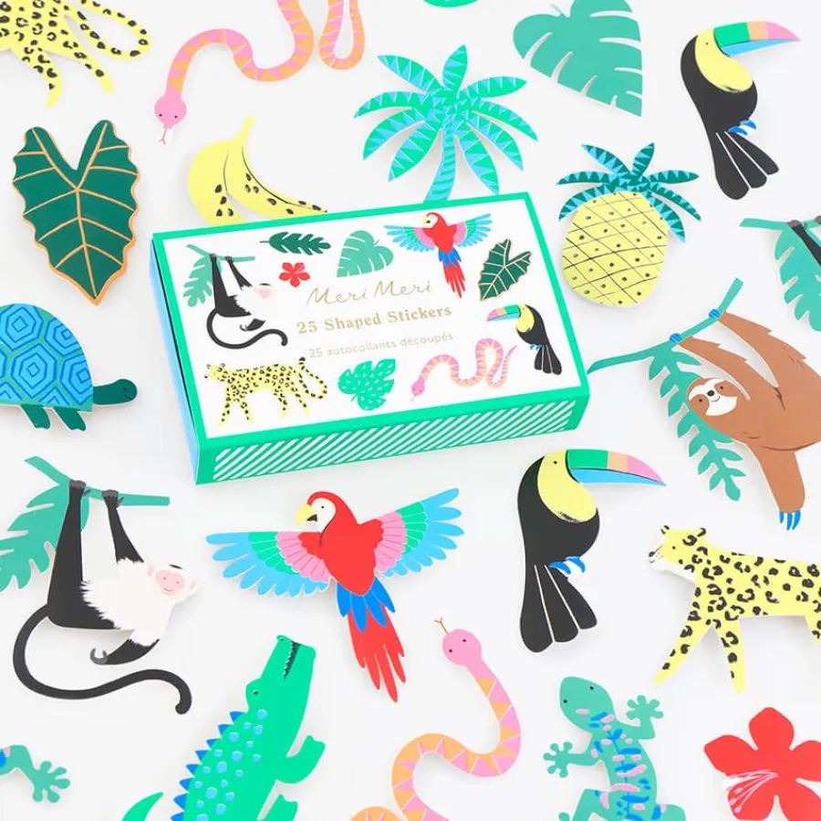 25 απίθανα αυτοκόλλητα σε 16 σχέδια εμπνευσμένα από τη Ζούγκλα: τροπικά φύλλα, ιαγουάρος, παπαγάλος, τουκάν, φίδι, μαϊμού, κροκόδειλος, σαύρα γκέκο, χελώνα, λουλούδια, ανανάς, μπανάνες.