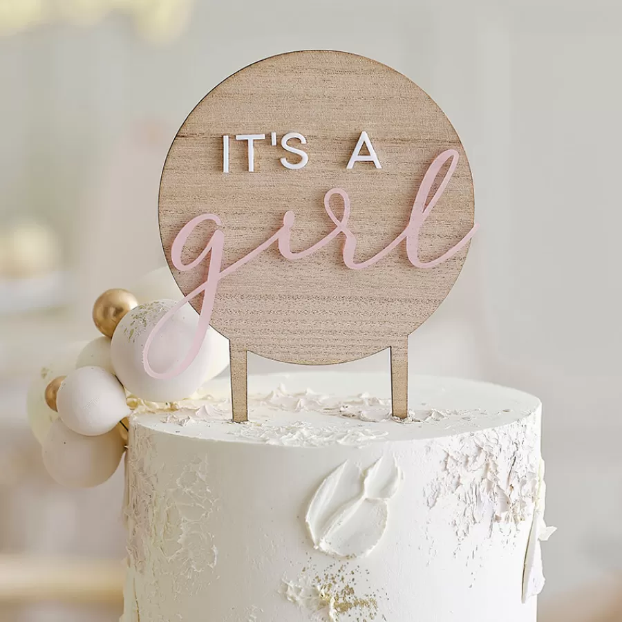 Ξύλινο διακοσμητικό για τούρτα "It's a Girl" με λευκά & ροζ γράμματα.