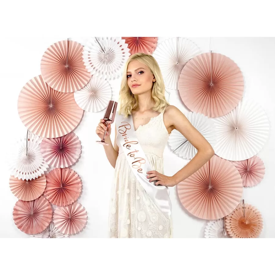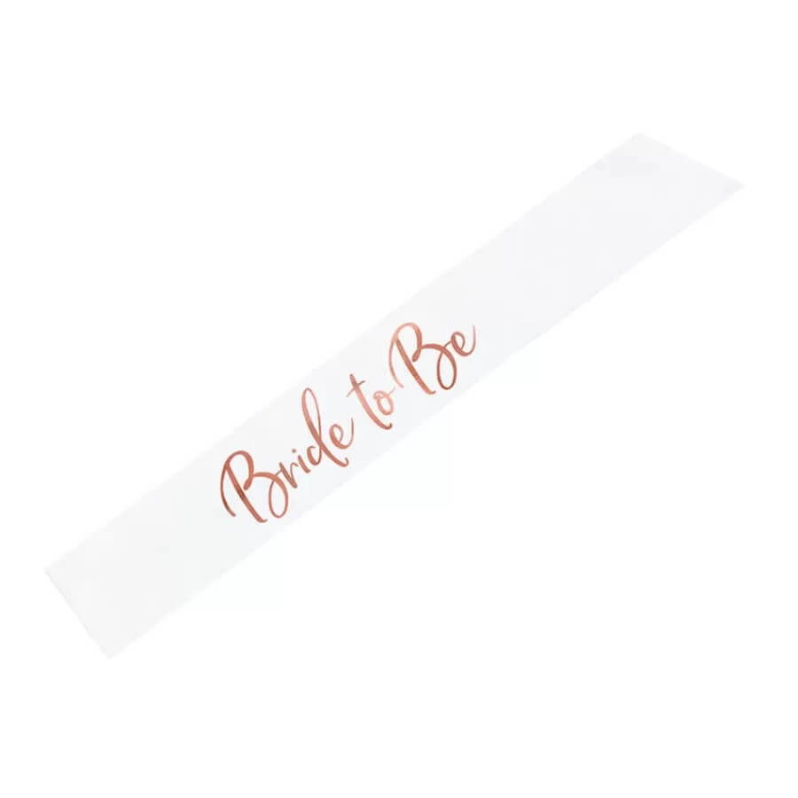 Λευκή σατέν κορδέλα που γράφει "Bride to Be" με rose gold γράμματα.