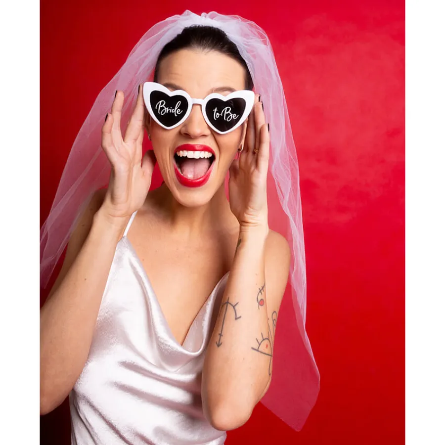 Λευκά πλαστικά γυαλιά καρδιές που γράφουν ''Bride to Be'' με λευκά γράμματα.