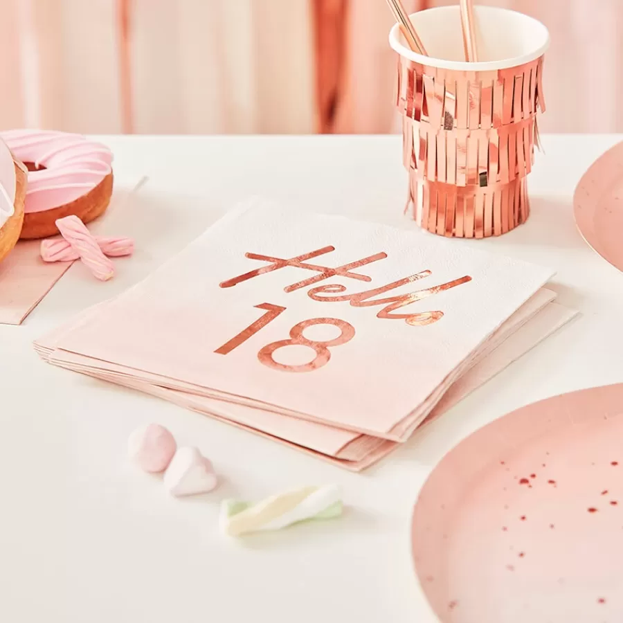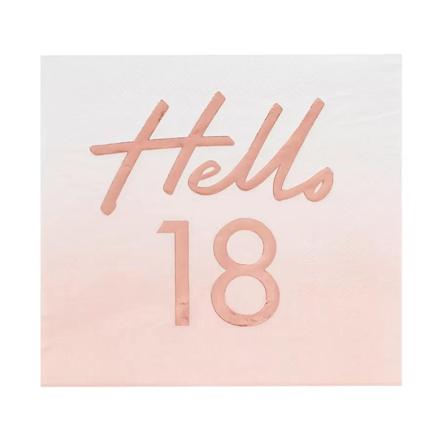 Ροζ ombre χαρτοπετσέτες που γράφουν "Hello 18" με rose gold γράμματα.