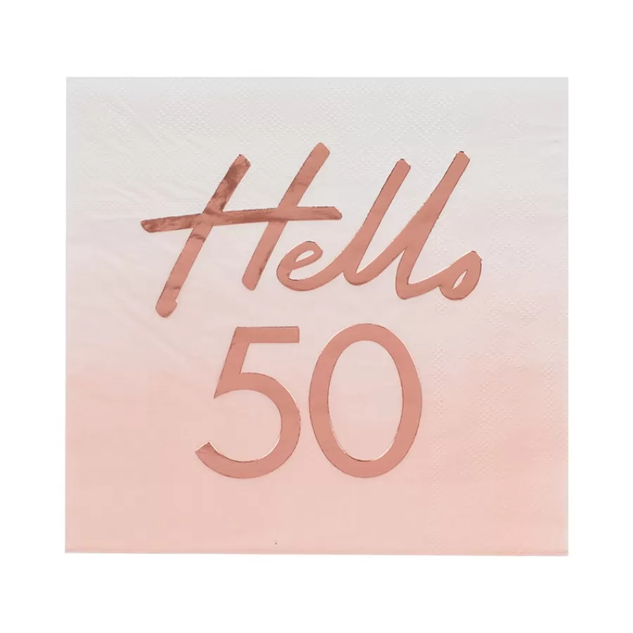 Ροζ ombre χαρτοπετσέτες που γράφουν "Hello 50" με rose gold γράμματα.