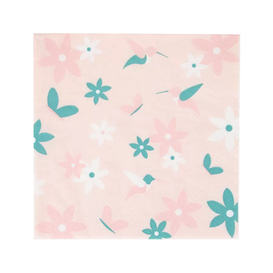 Ροζ χαρτοπετσέτες με σχέδιο τα λουλουδάκια & τα κολιμπρί.