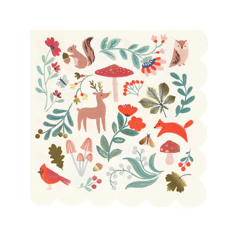 3φυλλες χαρτοπετσέτες Winter Woodland με ζωάκια του Δάσους, μανιτάρια, κλαδάκια με φύλλα & λουλούδια και χρυσές λεπτομέρειες.