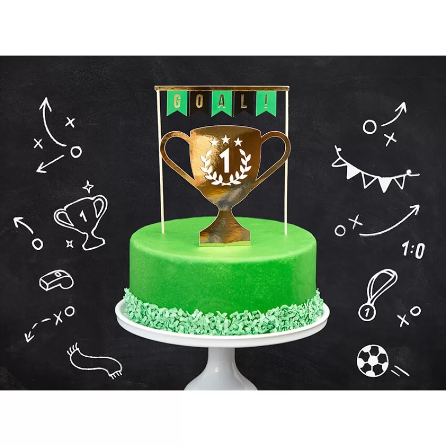 Το σετ περιλαμβάνει 2 χάρτινα toppers σε ξύλινα στικ: ένα κύπελλο & ένα banner που γράφει "Goal!".
