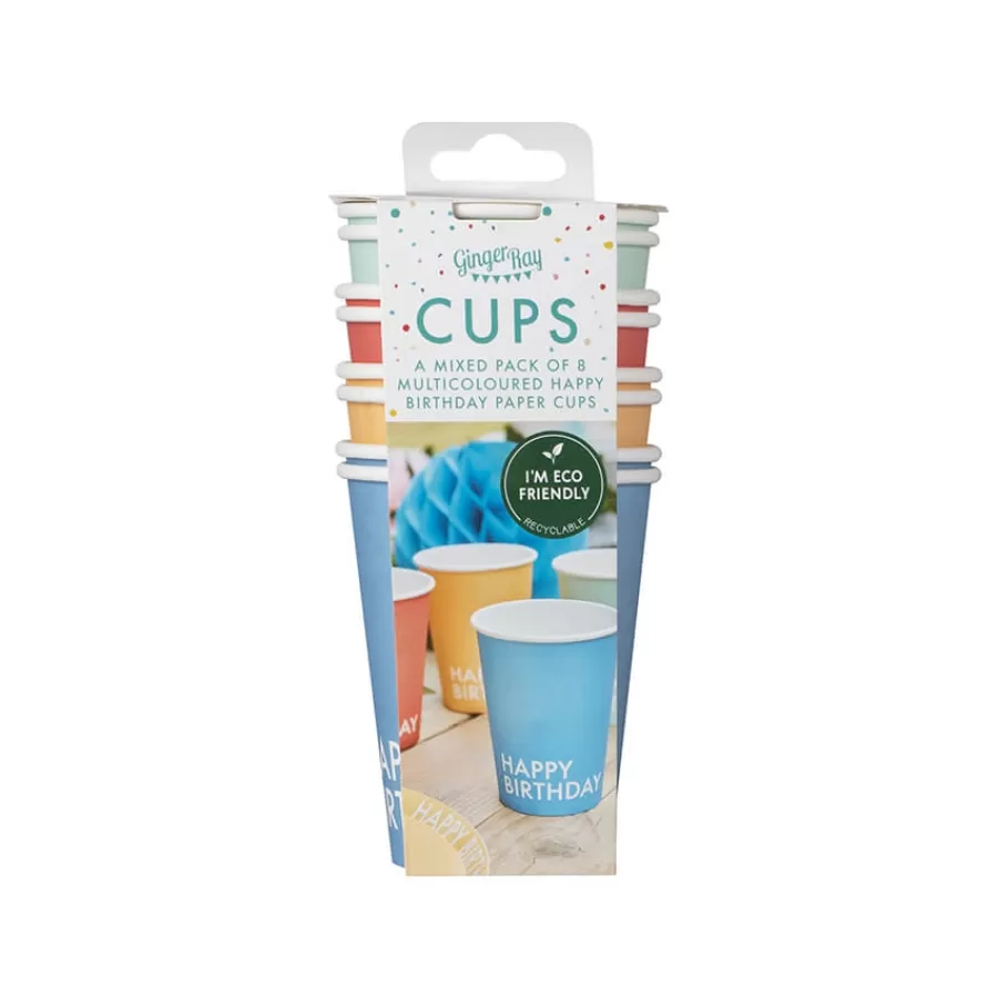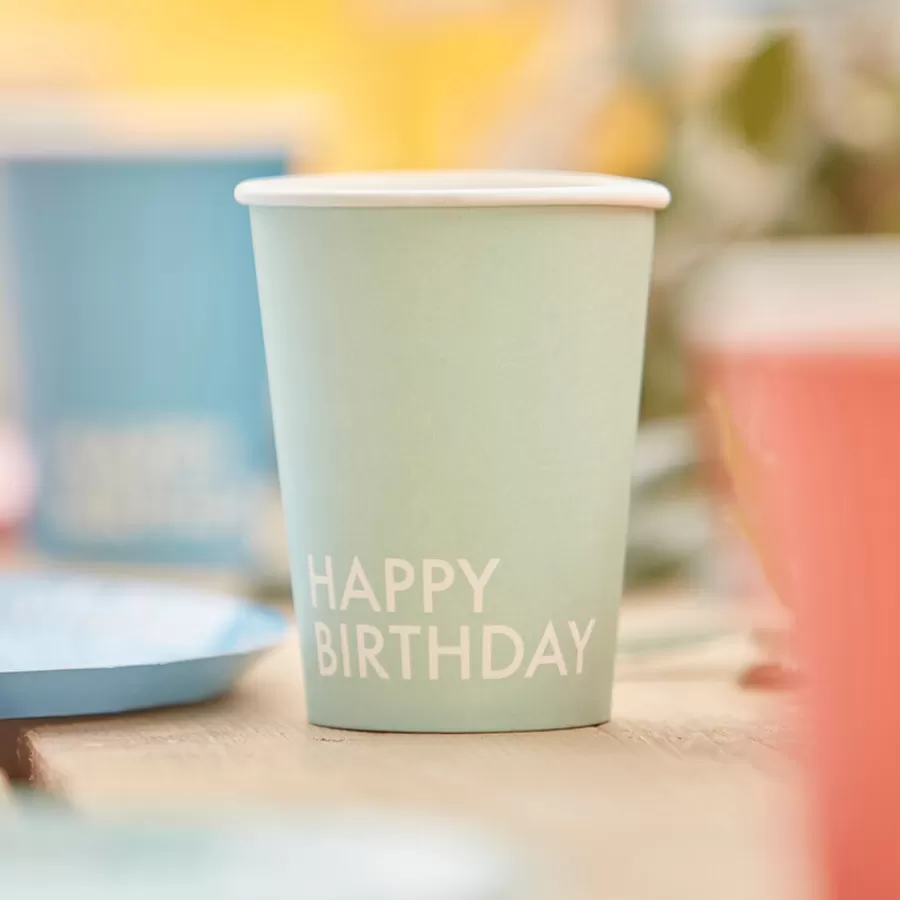 Χάρτινα ποτήρια "Happy Birthday" κοραλί/κίτρινα/σιέλ/βεραμάν - 8τμχ.