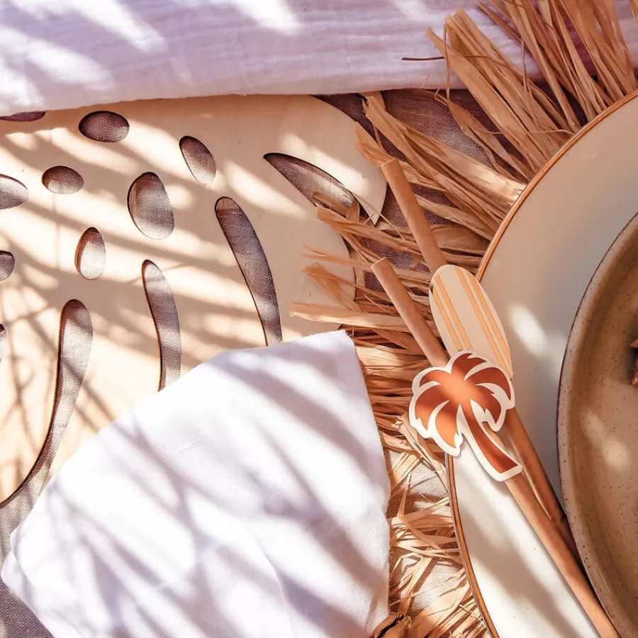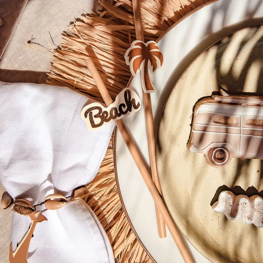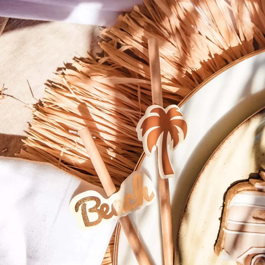 Χάρτινα καλαμάκια kraft με χάρτινα διακοσμητικά σε τέσσερα διαφορετικά σχέδια: "Beach", σανίδα του surf, φοίνικα & φύλλο μονστέρα.