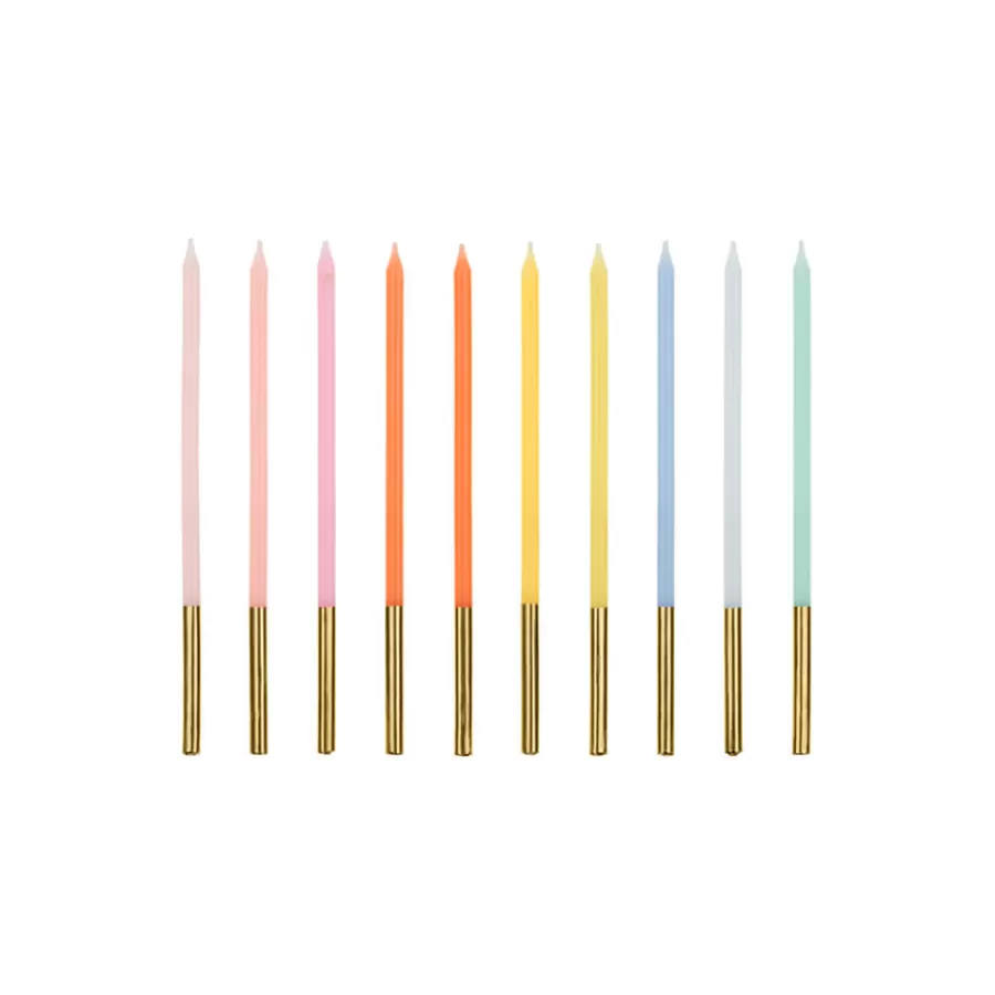 Δίχρωμα λεπτά κεράκια παστέλ σε 9 διαφορετικά χρώματα με τελείωμα από χρυσό χαρτί foil.