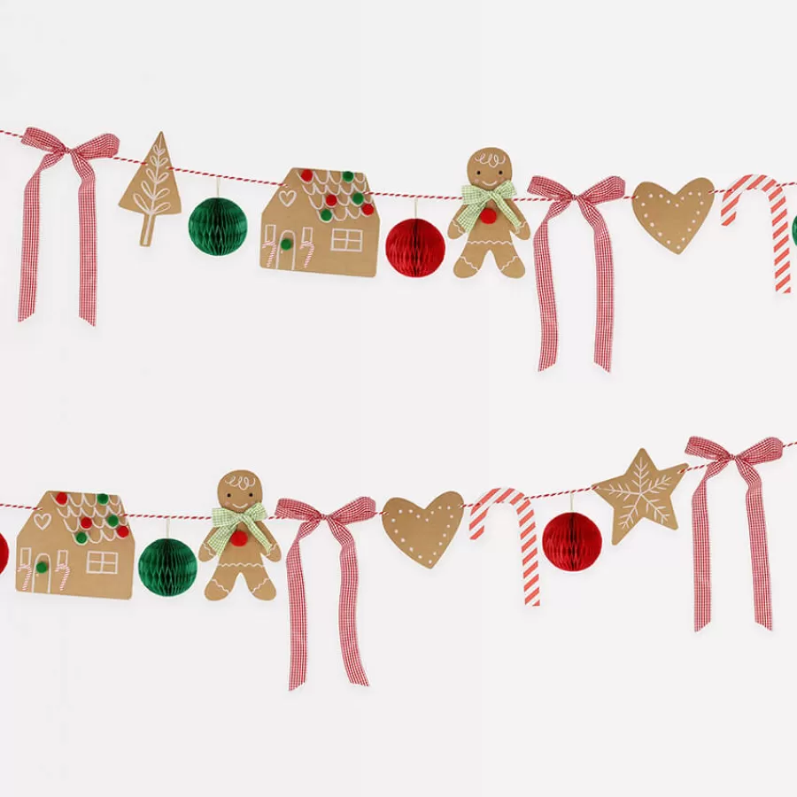 Γιρλάντα Gingerbread με κορδέλες & χάρτινα διακοσμητικά σε Χριστουγεννιάτικα σχέδια: Gingerbread Man, Gingerbread House, αστεράκια, έλατα, καρδούλες και μπάλες honeycomb.