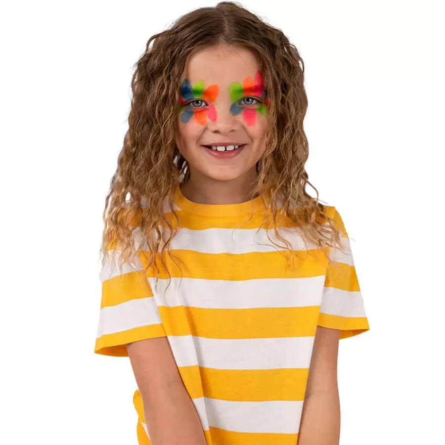 Μπογιές για face painting σε έξι έντονα χρώματα: φούξια fluo, πορτοκαλί fluo, πράσινο fluo, κίτρινο fluo, μπλε & μοβ.