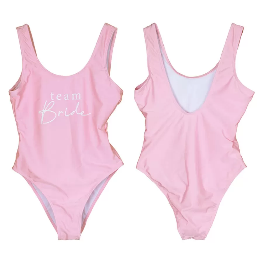 Ολόσωμο ροζ μαγιό που γράφει "Team Bride" με λευκά γράμματα.
