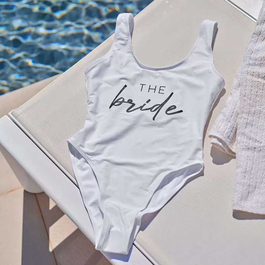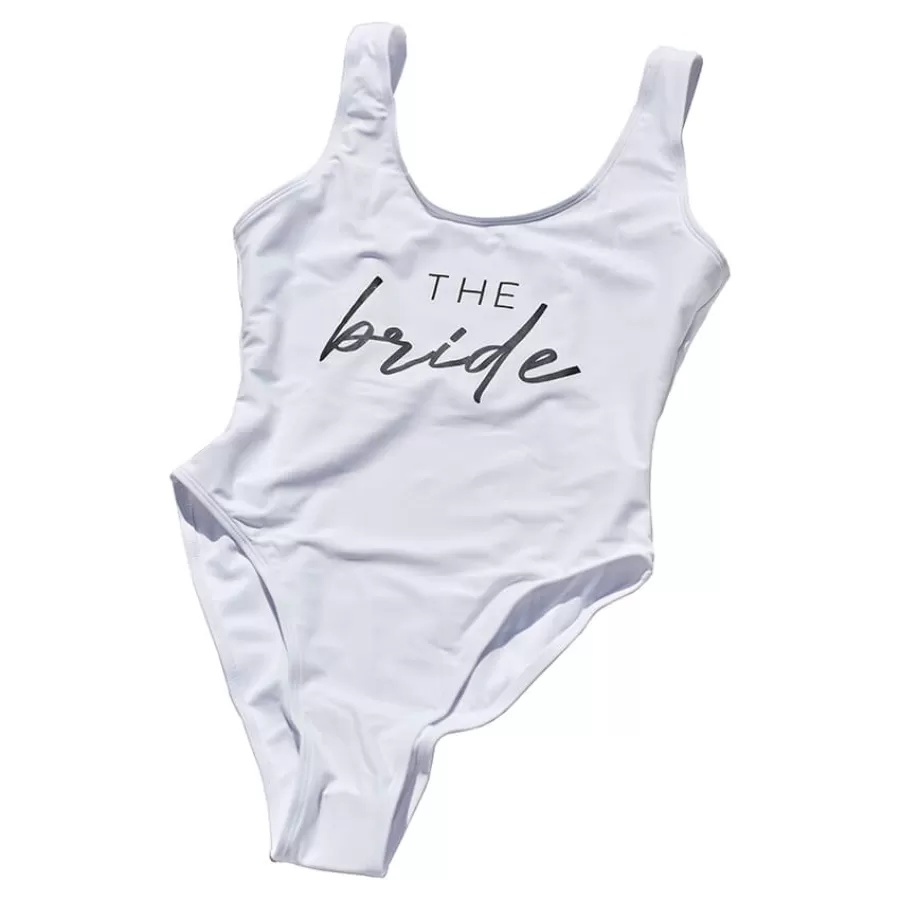 Ολόσωμο λευκό μαγιό που γράφει "The Bride" με μαύρα γράμματα.