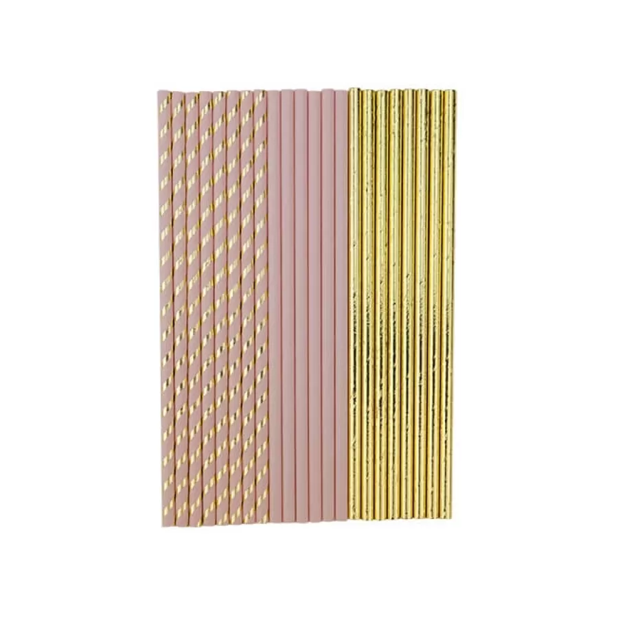 Χάρτινα καλαμάκια μονόχρωμα & ριγέ χρυσά/ροζ - 22τμχ.