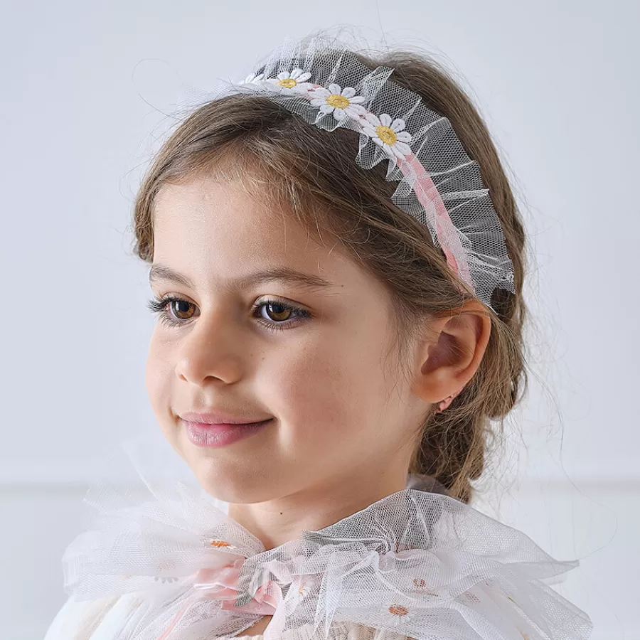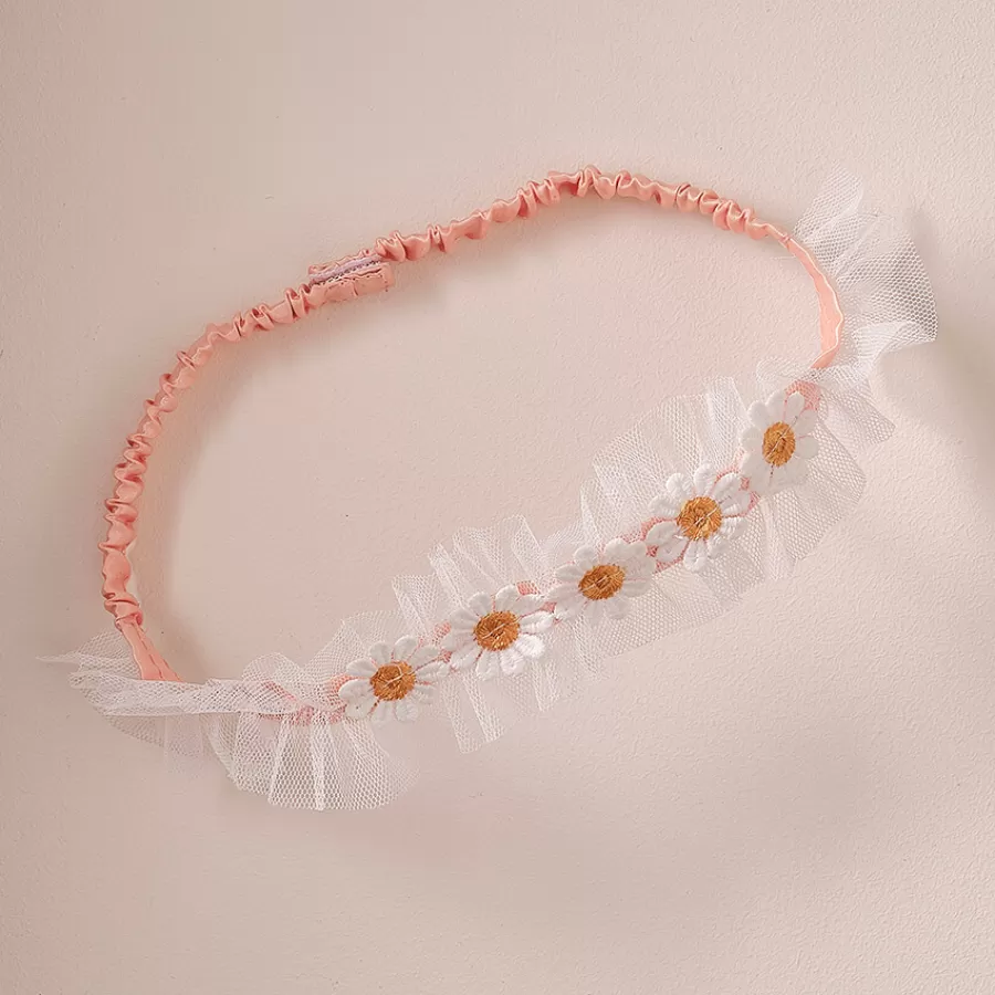 Κορδέλα σομόν για τα μαλλιά με λευκό τούλι & κεντημένες Μαργαρίτες.