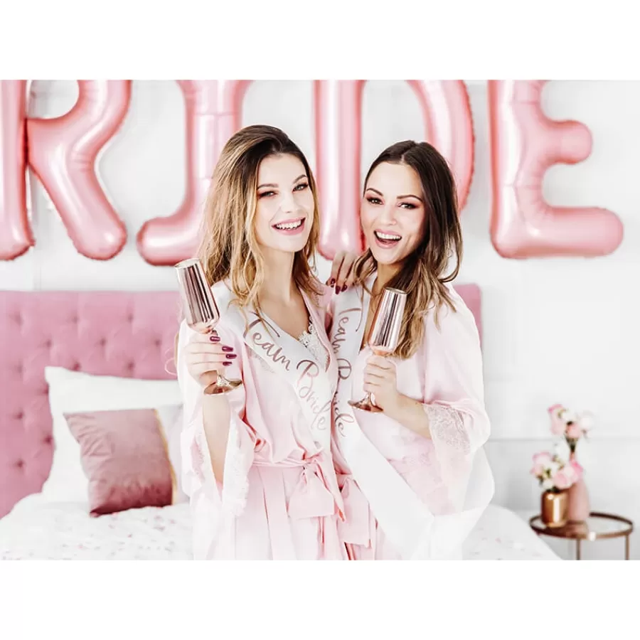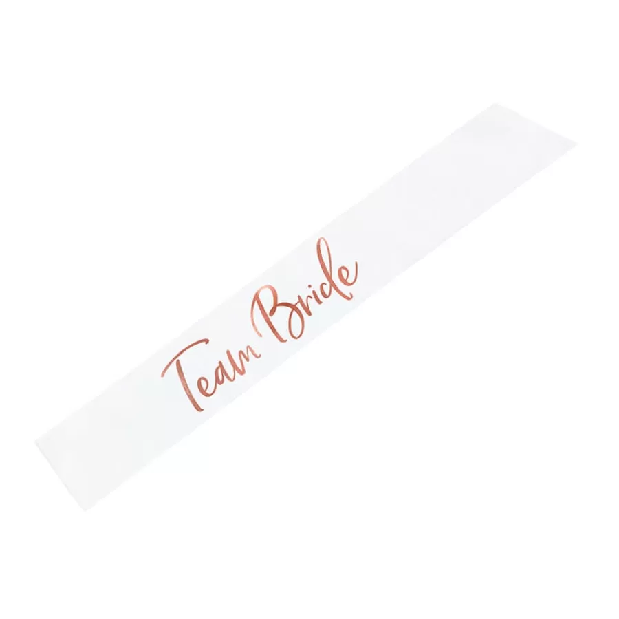 Λευκή σατέν κορδέλα που γράφει "Team Bride" με rose gold γράμματα.