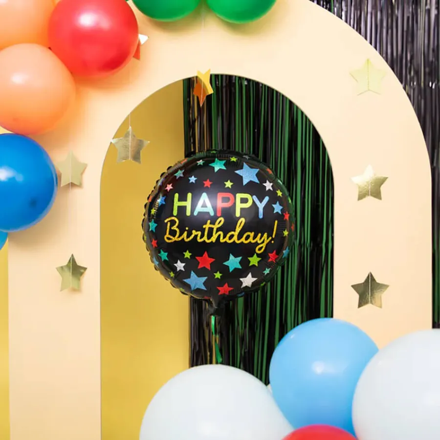 Μαύρο μπαλόνι "Happy Birthday" με πολύχρωμα αστεράκια.