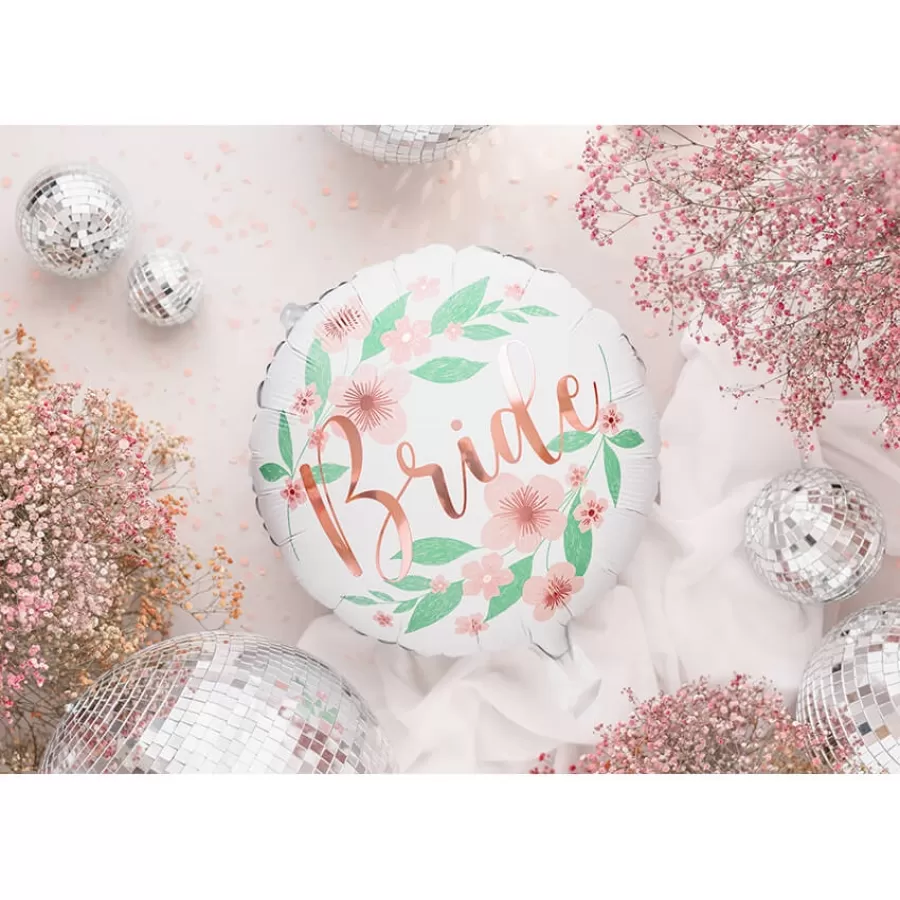 Λευκό στρογγυλό μπαλόνι foil με λουλουδάκια που γράφει "Bride" με rose gold γράμματα.