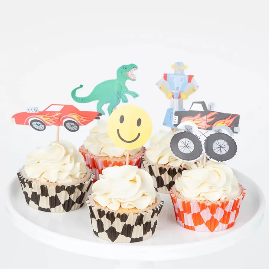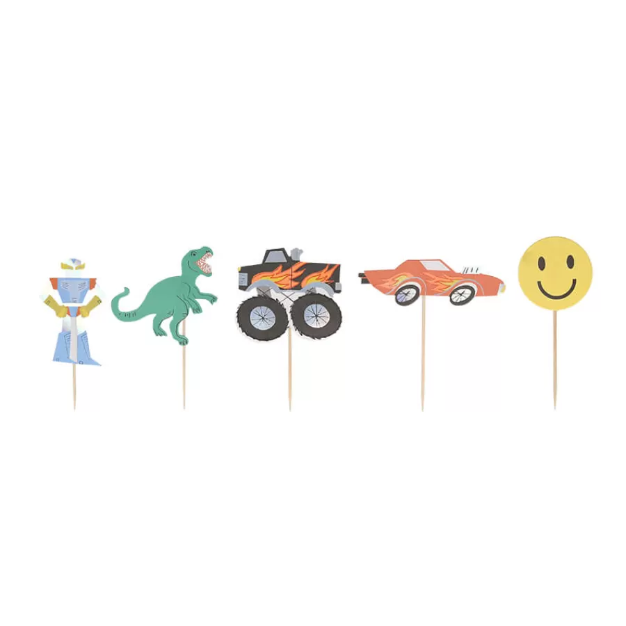 - 24 διακοσμητικά στικ για cupcakes σε 5 σχέδια: smiley face, δεινόσαυρος, αγωνιστικό αυτοκίνητο, ρομπότ & monster truck