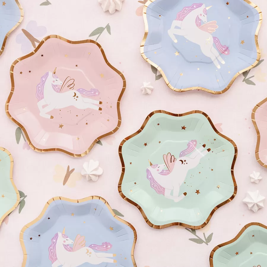 Χάρτινα πιάτα γλυκού Μονόκερος σε 3 παστέλ χρώματα: ροζ, βεραμάν & λιλά.