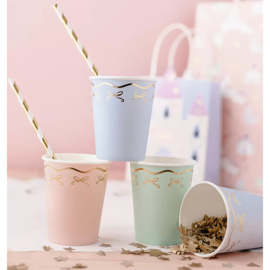 Χάρτινα ποτήρια με χρυσά φιογκάκια σε 3 παστέλ χρώματα: ροζ, βεραμάν & σιέλ.
