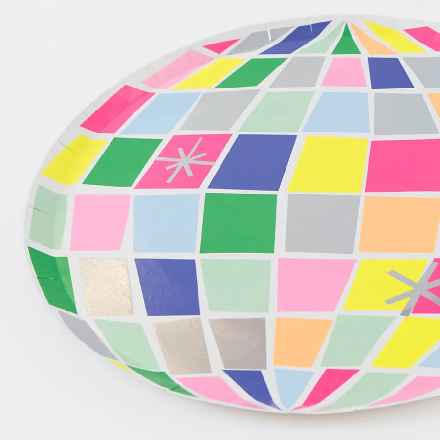 Χάρτινα πιάτα με σχέδιο ντισκομπάλας σε πολύχρωμες αποχρώσεις, που φέρνουν λάμψη και ρυθμό σε κάθε πάρτυ!