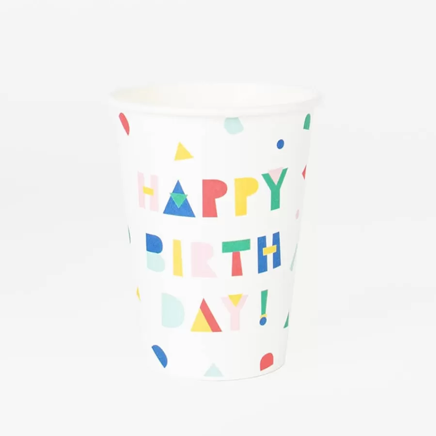 Χάρτινα ποτήρια "Happy Birthday" με πολύχρωμα γράμματα & σχέδια - 8τμχ.