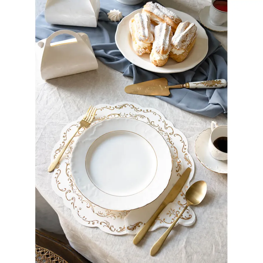 Λευκά σουπλά μιας χρήσεως από αδιάβροχο συνθετικό χαρτί, διακοσμημένα με χρυσές baroque λεπτομέρειες.