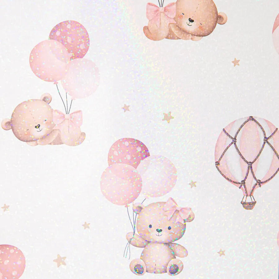 Ολογραφική σακούλα δώρου με αερόστατα & αρκουδάκια που κρατούν ροζ μπαλόνια.