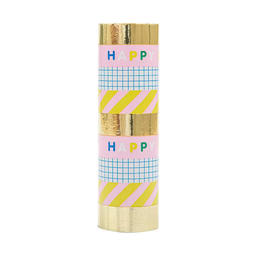 Μικρές σερπαντίνες σε τέσσερα σχέδια: χρυσό, ριγέ ροζ/κίτρινο, "happy birthday" & καρό μπλε.