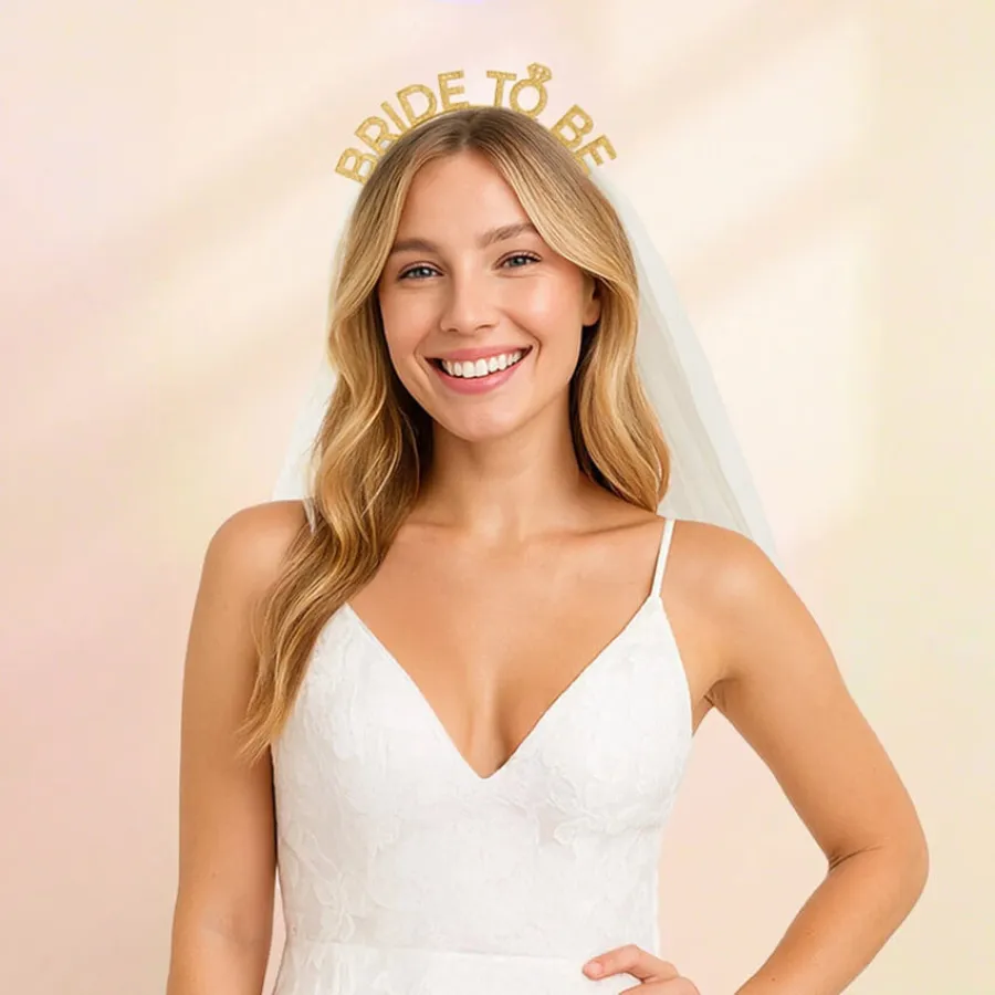 Χρυσή μεταλλική στέκα “Bride To Be” & λευκό πέπλο που στερεώνεται στα μαλλιά με κλιπ.