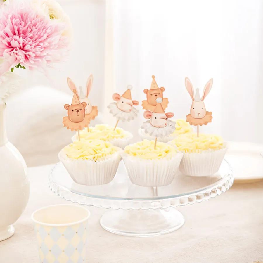 Διακοσμητικά στικ με χαριτωμένα ζωάκια: ποντικάκια, αρκουδάκια και κουνελάκια που φοράνε καπελάκια πάρτυ.