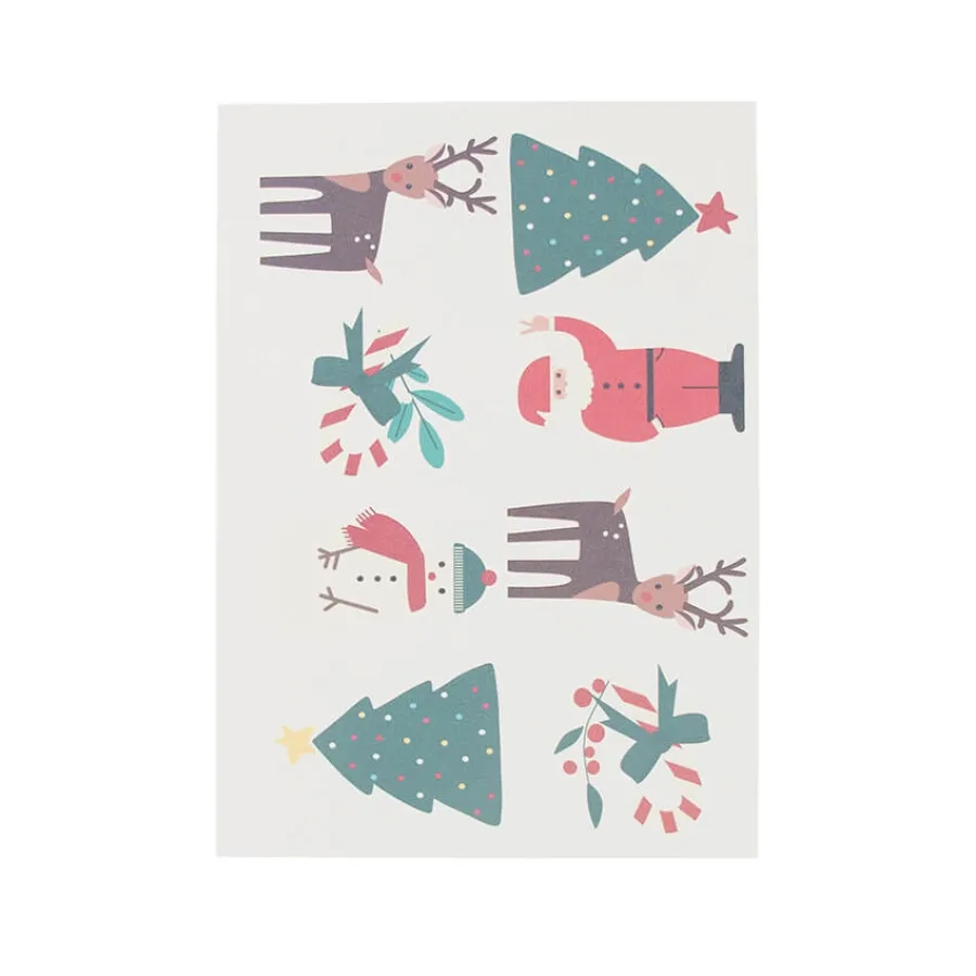 Η συσκευασία περιέχει 1 φύλλο με 8 τατουάζ σε 5 διαφορετικά σχέδια: έλατο, γλειφιτζούρι, Άγιος Βασίλης, ελαφάκι και χιονάνθρωπος.