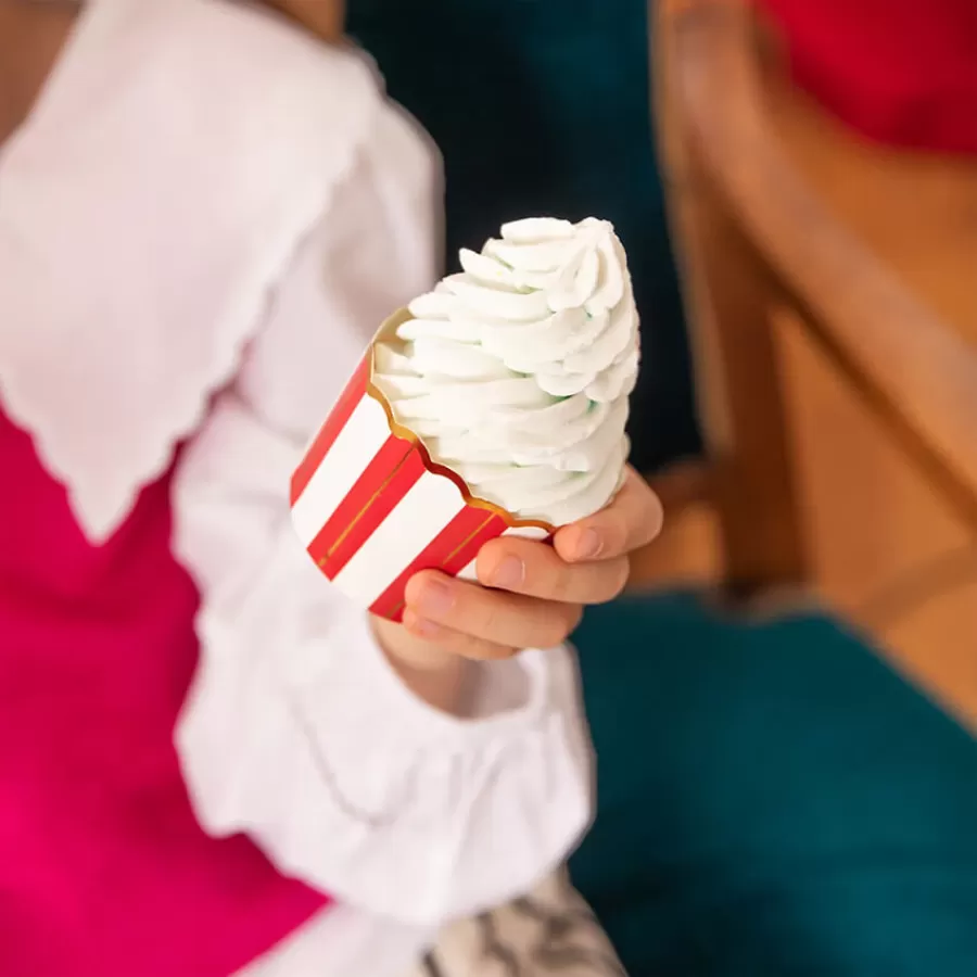 Χάρτινες διακοσμητικές θήκες σε δύο σχέδια: γλειφιτζούρια & ρίγες κόκκινες/λευκές με χρυσές λεπτομέρειες.