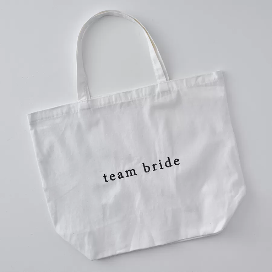 Λευκή υφασμάτινη τσάντα "Team Bride" με μαύρα γράμματα.