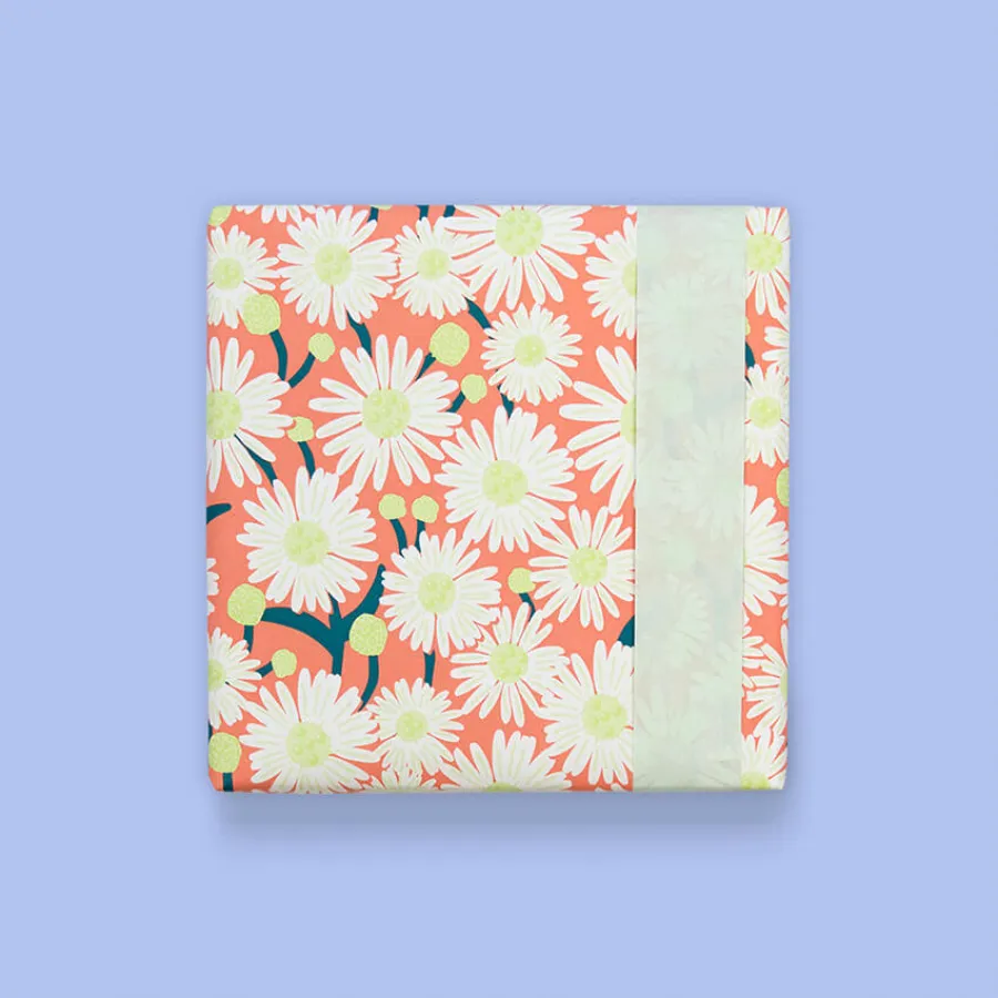 Οικολογικό χαρτί περιτυλίγματος διπλής όψεως με διαφορετικό σχέδιο σε κάθε πλευρά: μαργαρίτες σε σκούρο σομόν φόντο & μονόχρωμο φυστικί.