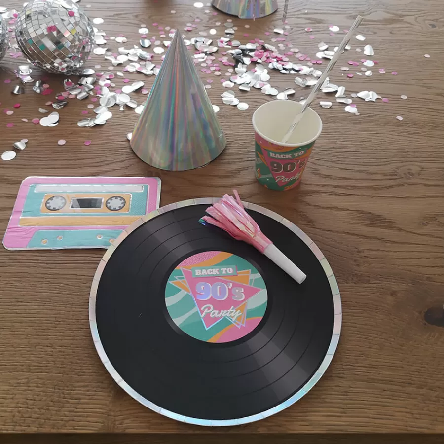 Χάρτινα πιάτα "Back to 90's Party" σε σχέδιο δίσκου με ολογραφικές λεπτομέρειες.