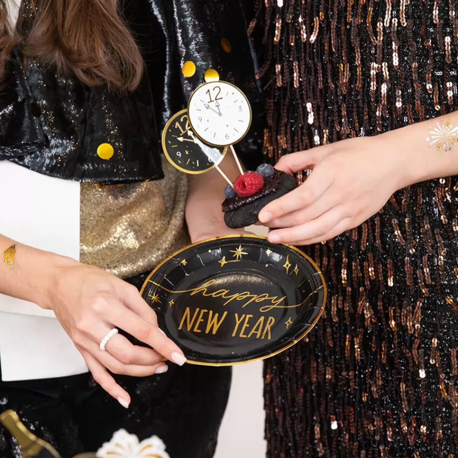 Χάρτινα πιάτα γλυκού "Happy New Year" μαύρα με χρυσά γράμματα - 6τμχ.