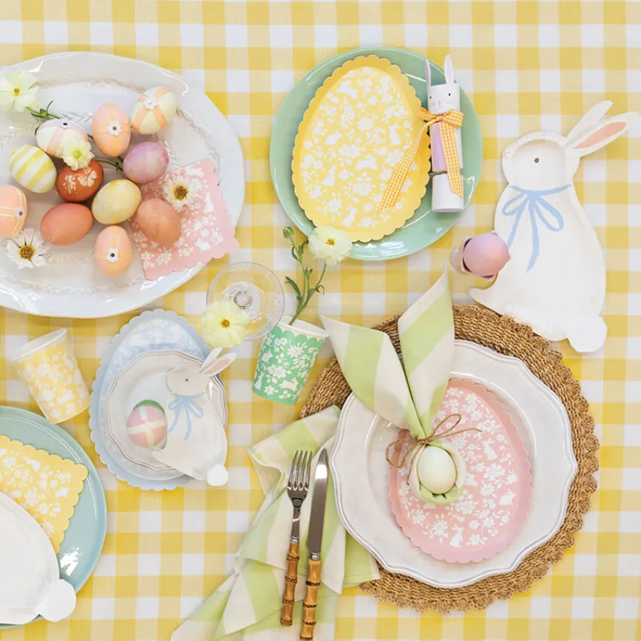 Χάρτινα πιάτα γλυκού σε σχήμα πασχαλινού αβγού με μικρά λευκά κουνελάκια & λουλουδάκια, σε τέσσερα παστέλ χρώματα: σιέλ, ροζ, φυστικί & κίτρινο.