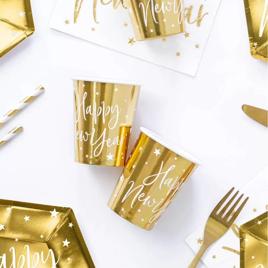 Χάρτινα χρυσά ποτήρια "Happy New Year" με λευκά αστεράκια. Ιδανικά για το πιο λαμπερό Πρωτοχρονιάτικο ρεβεγιόν!