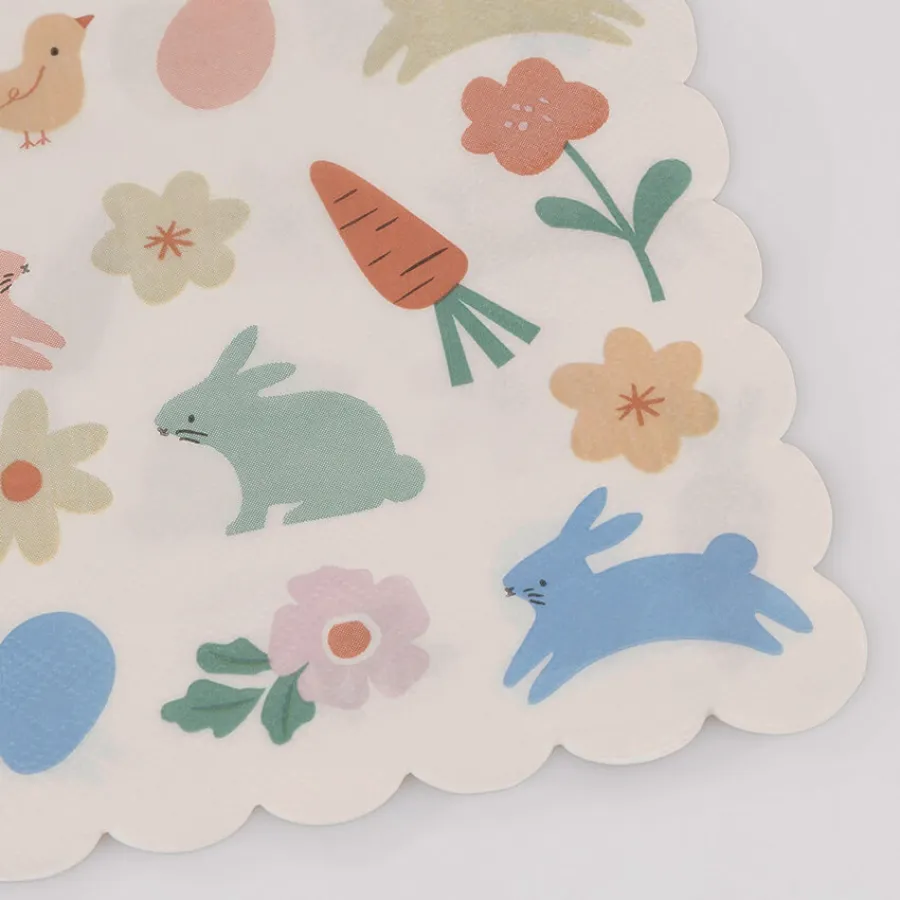 3φυλλες χαρτοπετσέτες με πασχαλινά σχέδια: λουλουδάκια, κουνελάκια, κοτοπουλάκι, καρότα & αβγά, σε απαλές, ανοιξιάτικες αποχρώσεις.