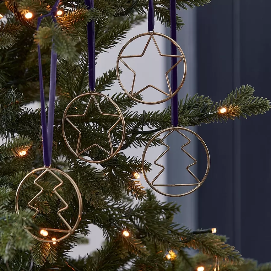 Χρυσά μεταλλικά Χριστουγεννιάτικα στολίδια με μπλε βελούδινο κορδελάκι σε δύο σχέδια: έλατο & αστεράκι.